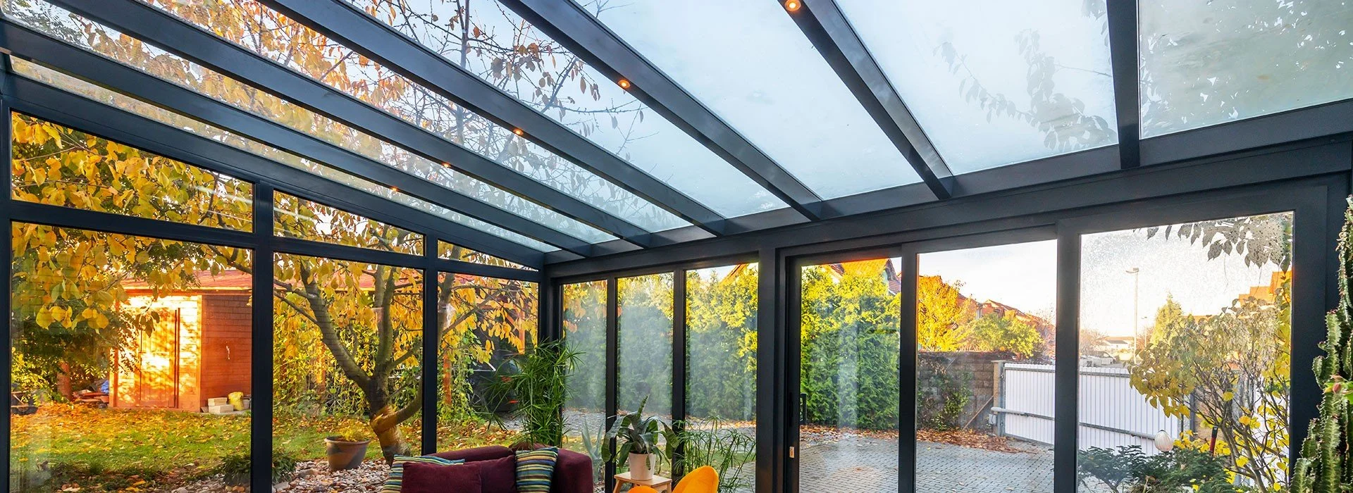 Our winter garden roof system is designed to provide an elegant, well-insulated space that is flooded with light. Its slim, delicate rafters give the roof a sleek appearance and allow plenty of light to enter the winter garden. The external structural members also help to create a light and airy ambiance inside the winter garden. This roof system is highly sophisticated and can be used to create even large roof structures with ease. It is also thermally insulated and can be used on roof pitches from 5° to 45°. The roof ventilation system, which has an automatic control system, helps to keep the extension well-ventilated.